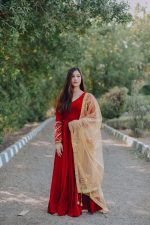 RED VELVET REFLECTIVE MIRROR WORK ANARKALI WITH EMBELLISHED DUPATTA