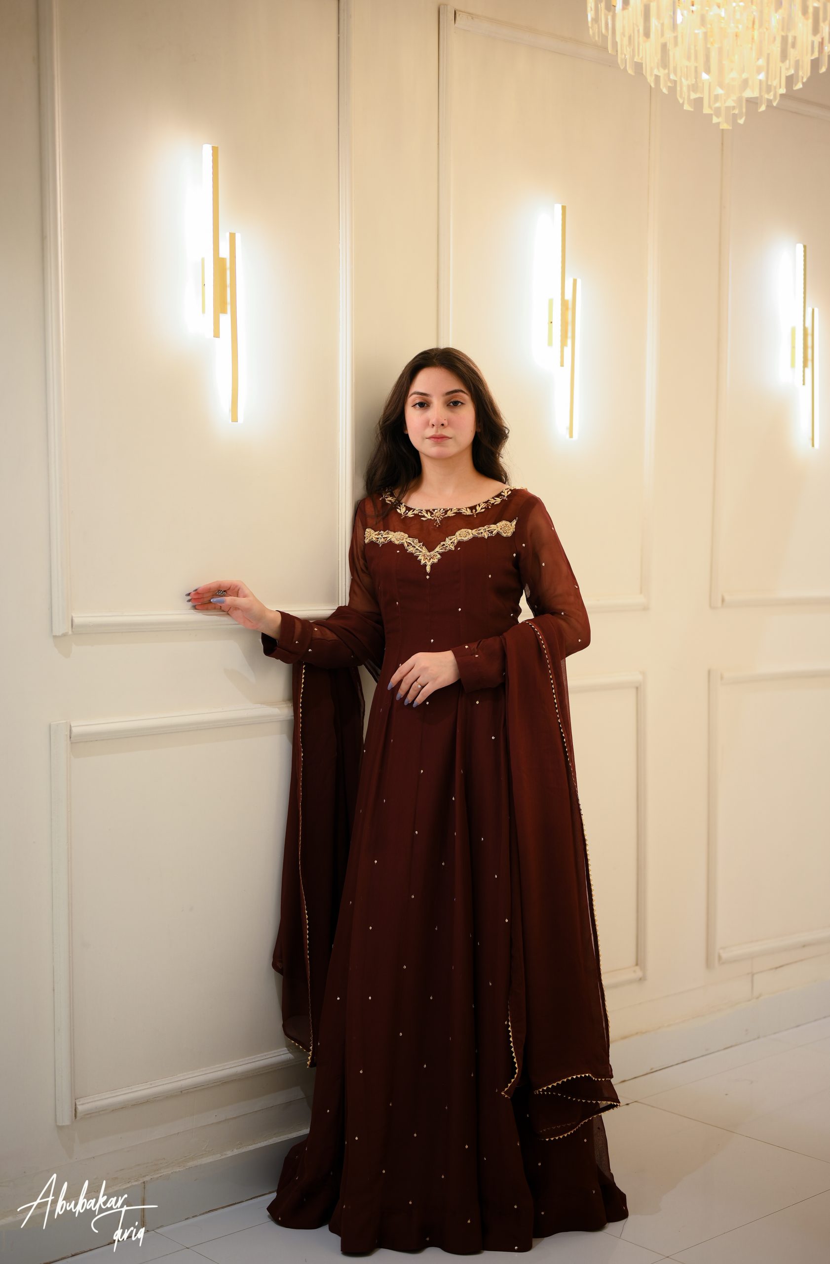 SOLID BROWN HAND EMBELLISHED ANARKALI DET