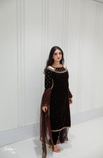 SOLID BROWN HAND EMBELLISHED VELVET KURTA TROUSER WITH DUPATTA