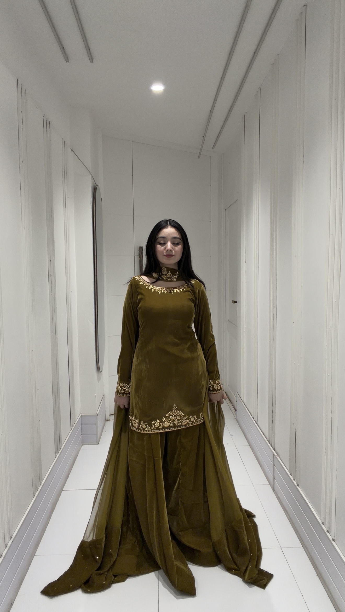 SOLID GREEN/BLUE DOUBLE SHADED PURE FRENCH VELVET KURTA WITH FARSHI SHALWAR AND DUPATTA