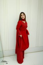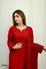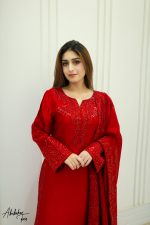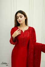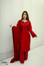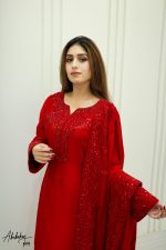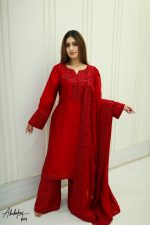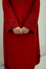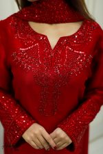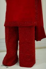 SOLID RED HAND EMBELLISHED KURTA WITH FARSHI SHALWAR AND DUPATTA Original price was: ₨65,000.00.Current price is: ₨40,000.00.