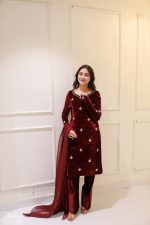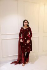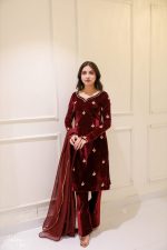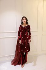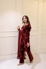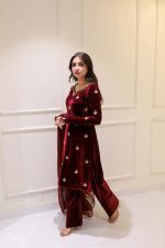 SOLID MAROON VELVET HAND EMBELLISHED KURTA PAJAMA WITH DUPATTA Original price was: ₨25,000.00.Current price is: ₨18,000.00.
