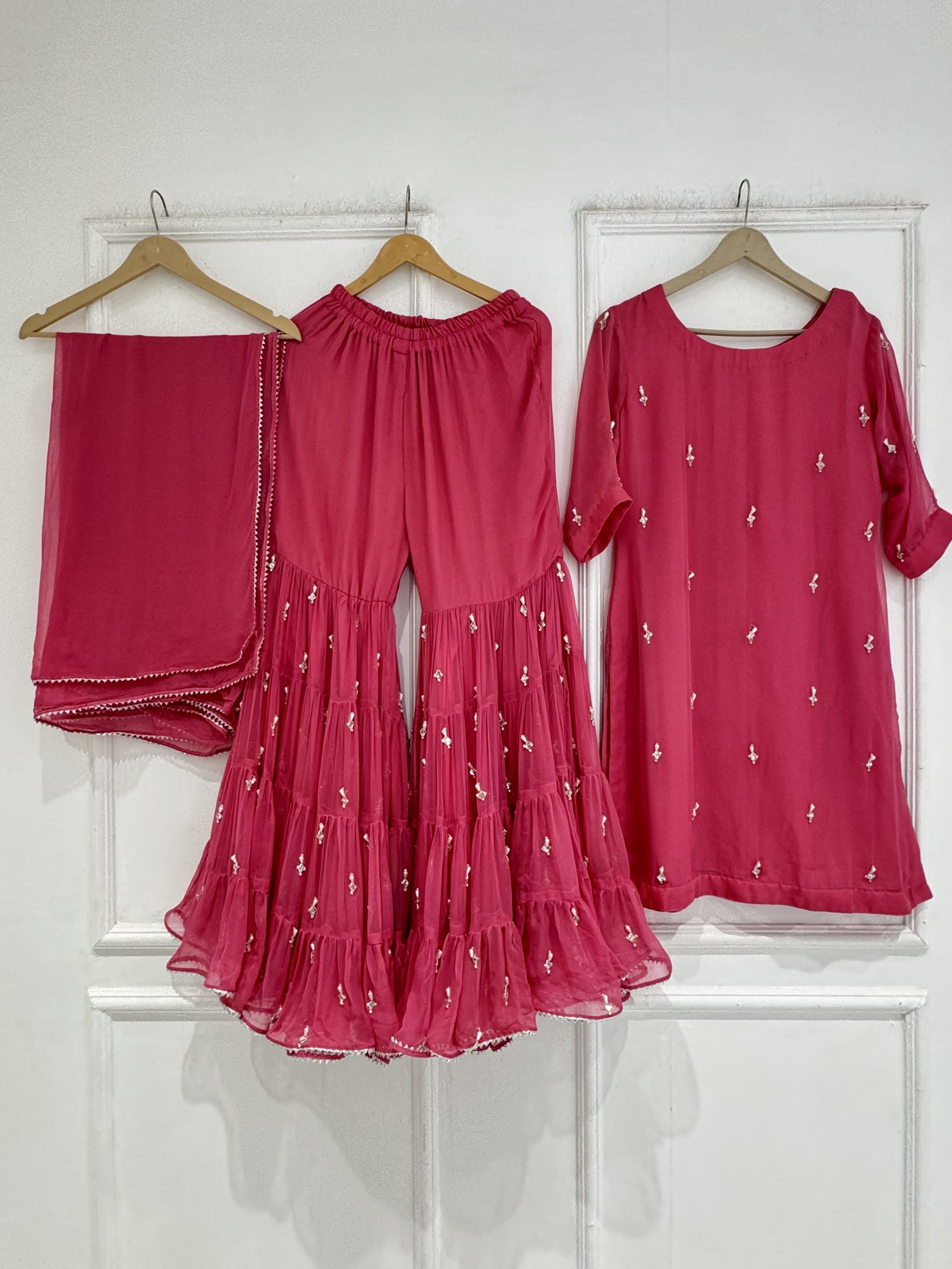 SOLID SHOCKING PINK HAND EMBELLISHED KURTA WITH GHARARA AND DUPATTA