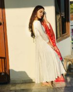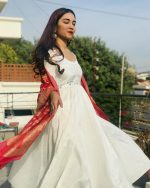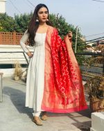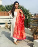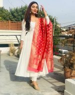 Be the first to review “SOLID WHITE LONG FLARED MIRROR EMBELLISHED ANARKALI SET WITH RED BANARSI DUPATTA”